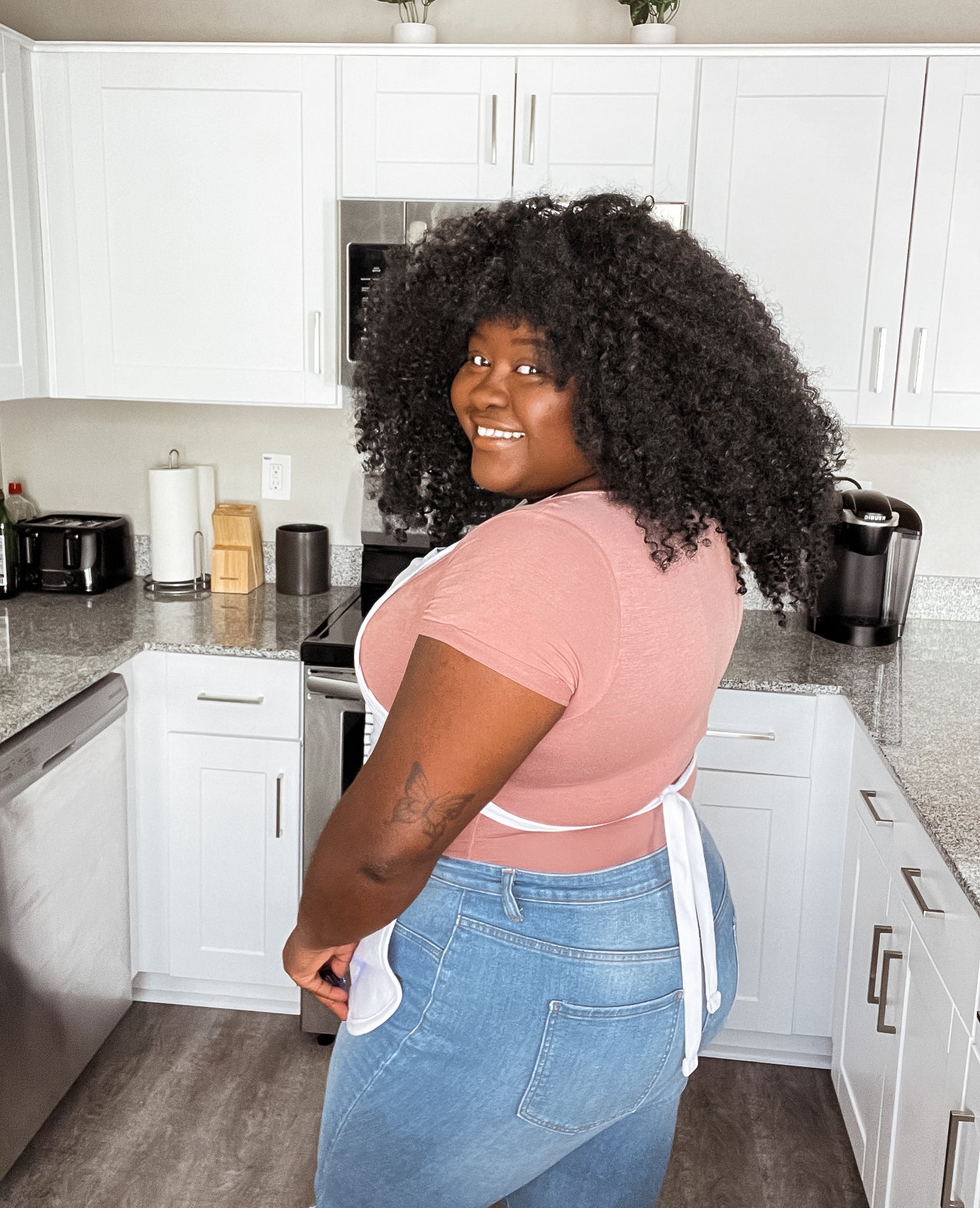 Our On My Grown Woman Sh*tapron has a modern, fresh style that celebrates all things Black Culture. This versatile apron features an adjustable neck strap with a buckle and waist ties. With three front pouch pockets, this truly functional apron is perfect for cheffin’ it up, painting art, and keeping your clothing clean.